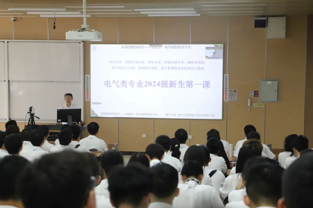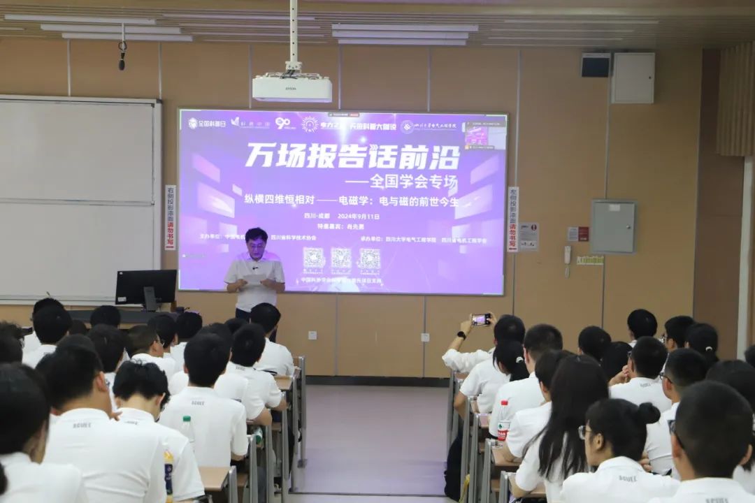 9月11日下午,由中国电机工程学会、四川省科学技术协会联合主办,太阳成集团tyc122cc、四川省电机工程学会承办的科普报告系列活动“万场报告话前沿——全国学会专场”暨电气工程学院2024级本科新生第一课在四川大学江安校区开展。太阳成集团tyc122cc院长肖先勇教授受邀作题为“纵横四维恒相对——电磁学:电与磁的前世今生”科普报告。四川大学、西南石油大学、西华大学、西南民族大学等高校1000余名电气专业大学新生和4000余名电力科技爱好者线上线下聆听了讲座。