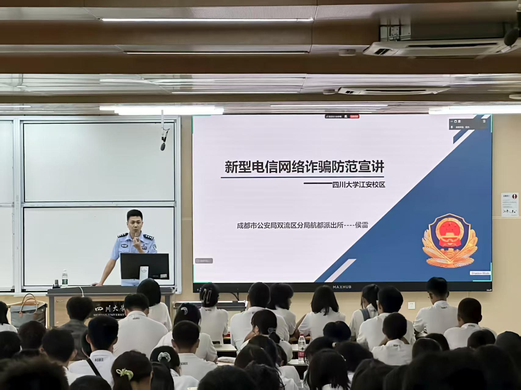 四川省大学生法治宣讲团和成都市公安局双流分局民警侯雷警官分别于9月4日、9月16日为我院2025级新生开展了预防网络电信诈骗专题科普讲座。侯警官通过真实案例警示新生要提高防范意识,深入讲解了常见诈骗手法的识别与防范要点,强调“与钱有关的事情务必核实身份”。同学们现场在警官指导下安装“国家反诈中心”APP,讲座切实增强了新生的网络安全意识和反诈防骗能力。