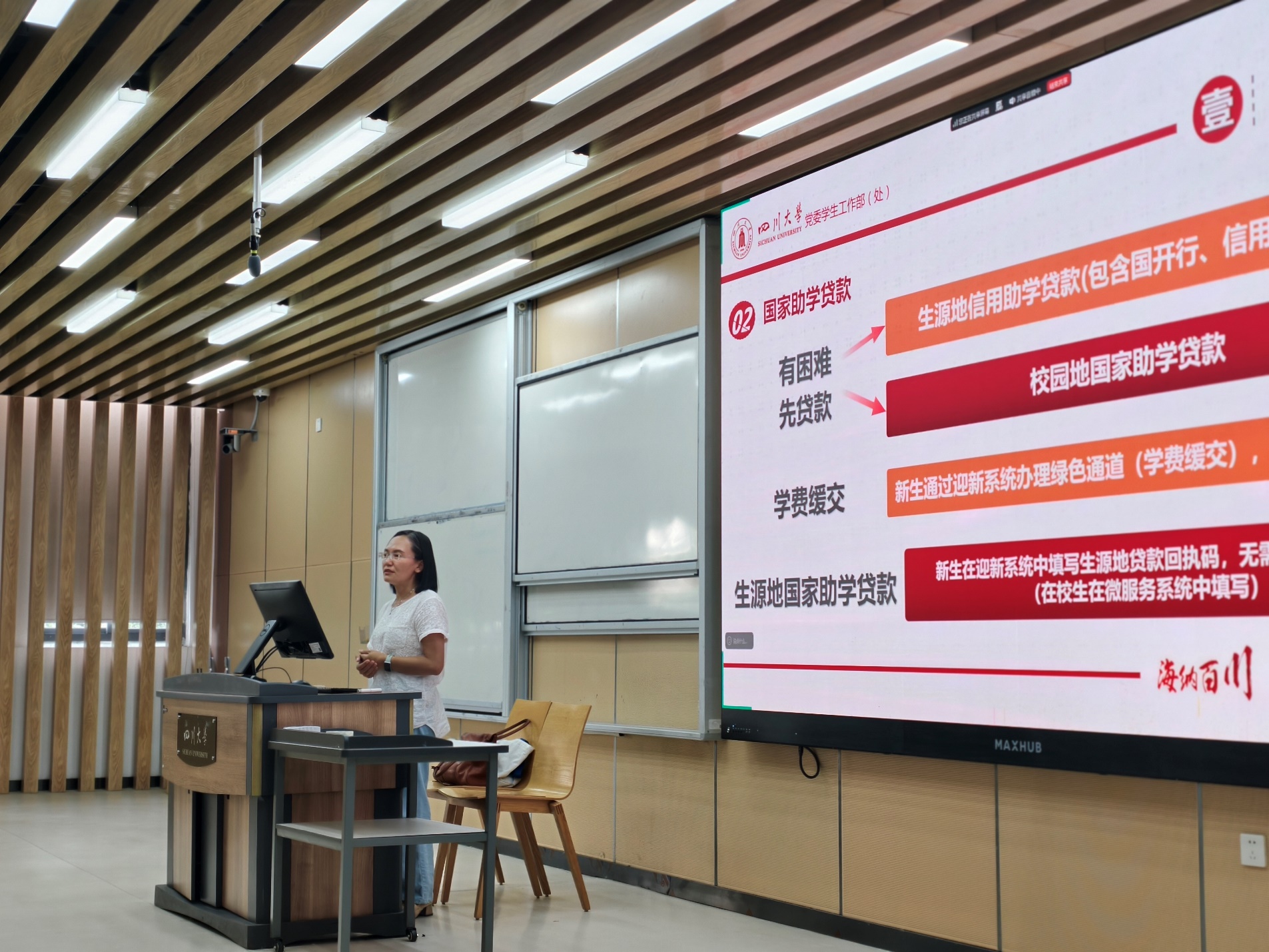 同日下午,学工部资助中心卓玛老师为新生详细宣讲了学校资助政策。她系统介绍了以国家奖助学金、校园地贷款、勤工助学、困难补助等为核心的“八位一体”资助体系,强调学校承诺不让任何一名学生因家庭经济困难而失学。卓玛老师还对“成才计划”、能力提升工作坊及学生服务团队等特色项目进行了说明,助力学生全面发展,并提醒新生增强防范意识,警惕电信诈骗和不良校园贷,守护个人财产安全。