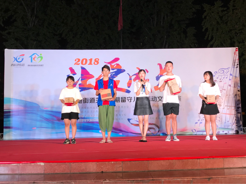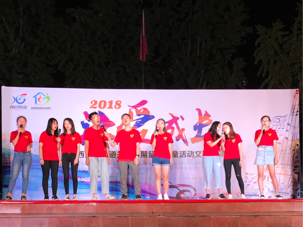 2018年8月10日晚,“西航港街道关爱暑期留守儿童”结业成果展示暨暑期社会实践文艺汇演在西航港街道综合文化活动中心隆重举行。本次晚会由中共成都市双流区西航港街道工作委员会和成都市双流区人民政府西航港街道办事处联合主办。西航港街道领导、电气信息学院“川爱”支教队青年志愿者、留守儿童及其家长一同观看了本次汇演。
