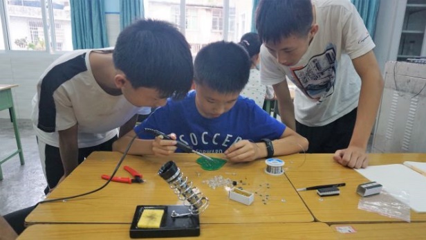 一天的相处在下课铃声中结束,少部分尚未完成焊接任务的学生依旧在努力尝试,不断向老师请教实践中遇到的问题。年纪尚小的他们虽然遇到了一些困难,但是刻苦钻研,敢于挑战的精神却让我们佩服不已。