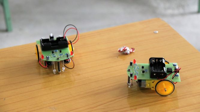 第二天,学生和老师在上课的铃声中迅速进入了上课状态。他们热情依旧,拿起了昨日未完成的循迹车和心形灯,在一次次的组装、焊接和合作中完成了昨日未完成的任务。