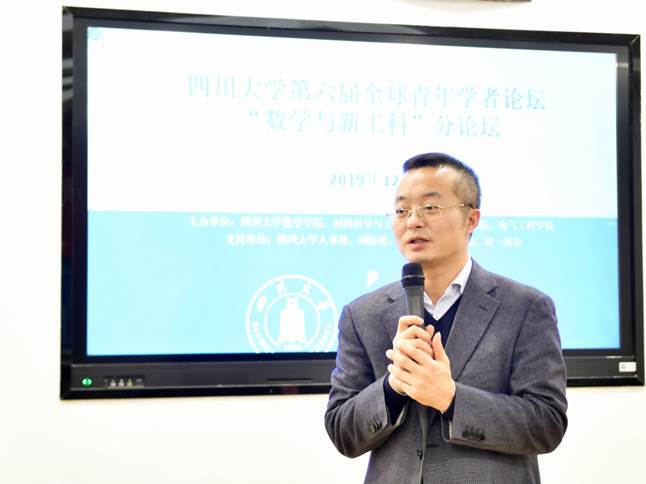 2019年12月14日上午九点半,四川大学第六届全球青年学者论坛——“数学与新工科”分论坛在基础教学楼成功举办。本次论坛以“数学与新工科”为主题,涵盖数学、材料、机械、电气等学科,旨在为一流人才创建一流学科交叉平台。四川大学人事处处长兼数学学院党委书记胡兵、青年人才工作科科长张愉,数学学院党委副书记覃孟念,材料科学与工程学院党委书记尹光福、党委副书记张晓满、副院长吴家刚、副院长林江莉、工会主席武莉莉,机械工程学院党委书记惠新强、院长王杰、副院长刘剑,电气工程学院党委书记韩芳、院长肖先勇,以及来自各学科的18名青年学者参加了分论坛大会,会议由韩芳主持。