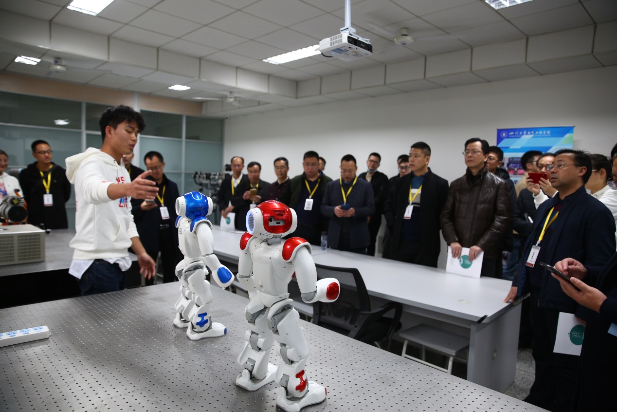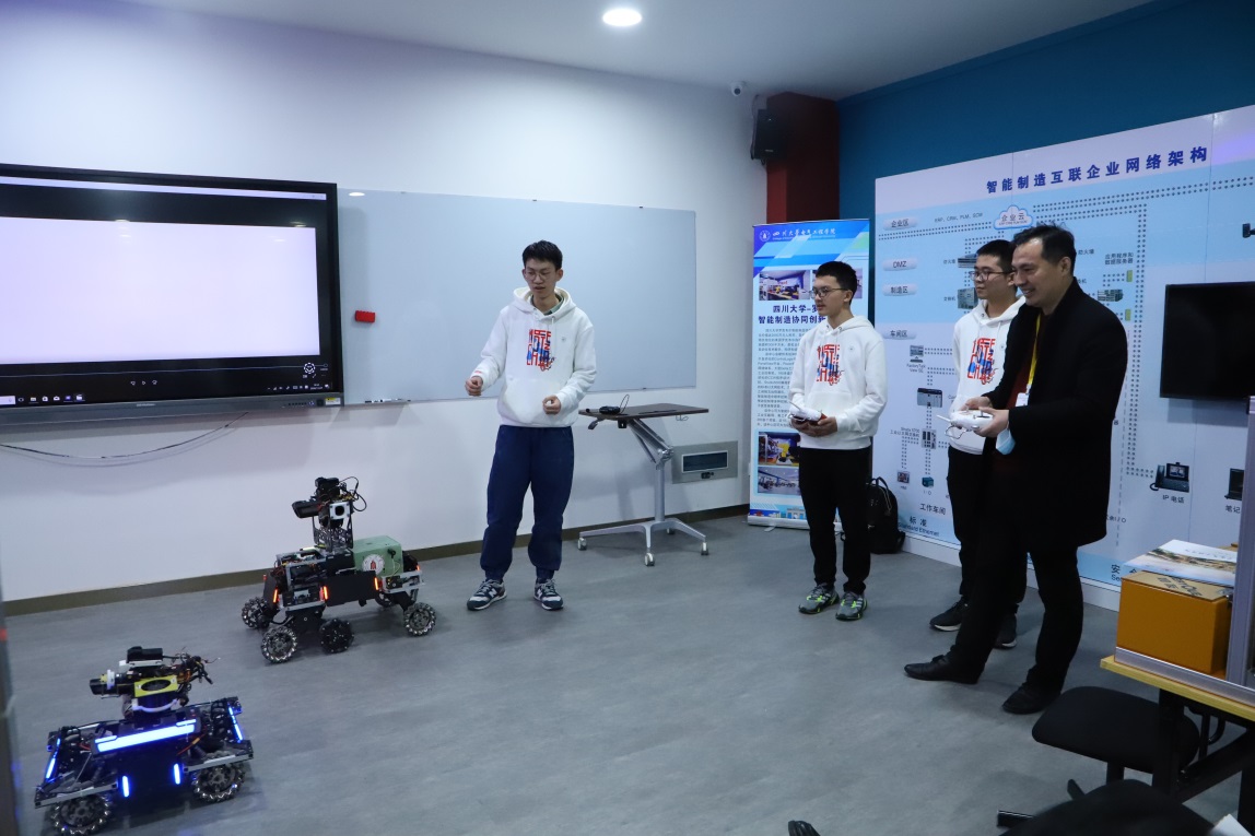 代表们首先来到四川大学——罗克韦尔智能制造协同创新中心参观,由实验室的博士向各位代表详细地介绍了创新中心团队的研究方向及负责的科研项目,重点展示介绍了蛇形臂及清扫机器人等机器人的研究与开发情况。