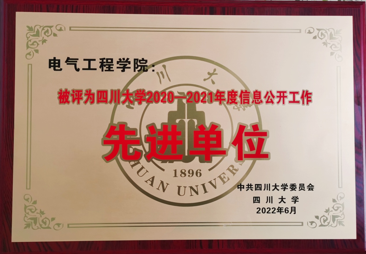 近日,学校信息公开办公室组织校内各单位进行了信息公开自查,并在自查基础上,开展了四川大学2020-2021年度信息公开工作先进单位评选表彰工作。电气工程学院被授予“四川大学2020-2021年度信息公开工作先进单位“称号。