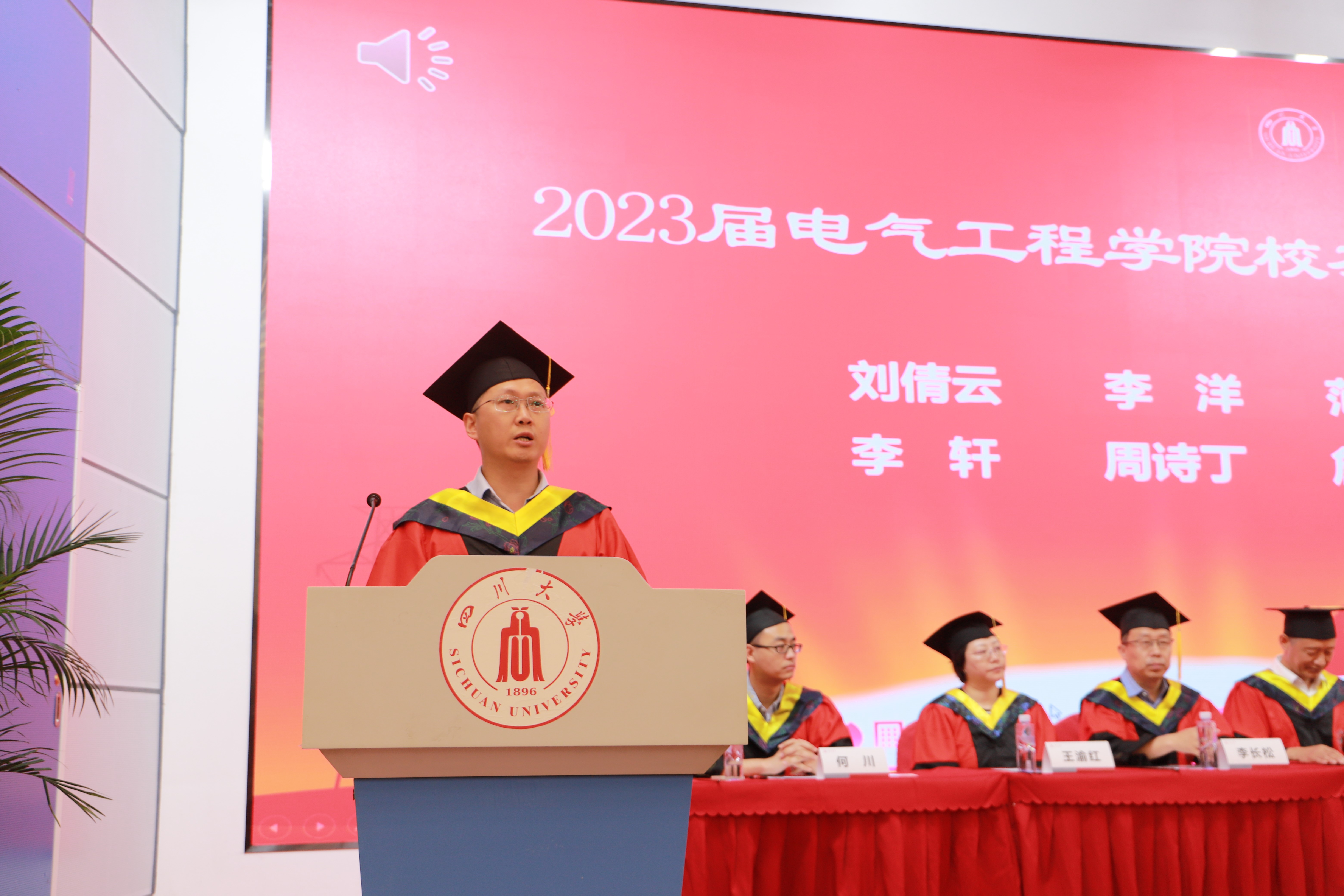 6月21日下午,太阳成集团tyc122cc2023届毕业典礼暨学位授予仪式在望江校区汇文楼演播厅隆重举行。四川大学教务处处长党跃武,电气工程学院党委书记赵昱辉、院长肖先勇,副书记张英敏、戴婷婷,副院长李长松、李成鑫,电气工程系主任王渝红、博导代表何川,自动化系主任赵涛、博导代表苗强,以及2023届毕业生和学生家长代表参加了毕业典礼。典礼由戴婷婷副书记主持。