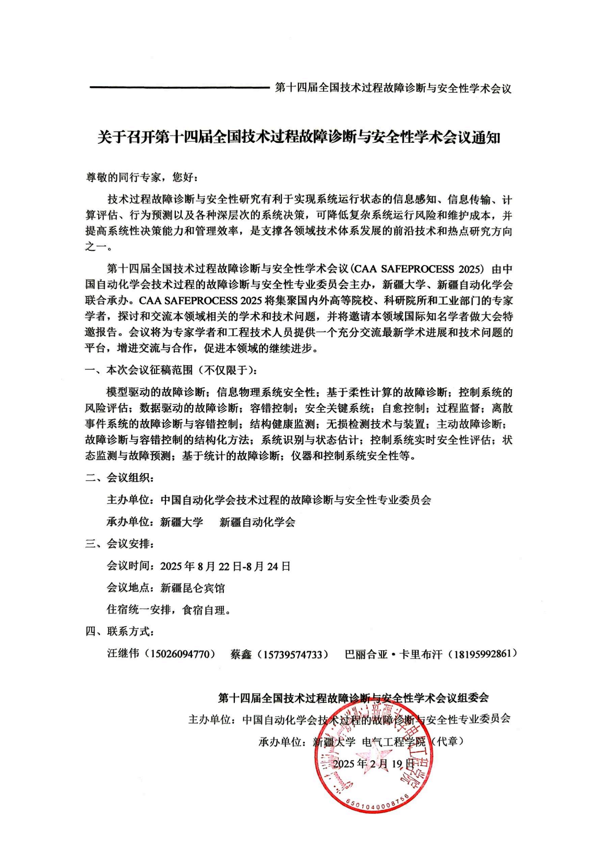 全国技术过程故障诊断与安全性学术会议由中国自动化学会技术过程的故障诊断与安全性专业委员会主办。会议每两年举办一次,旨在为从事相关领域和研究的国内外专家学者和工程技术人员提供一个充分交流最新学术进展和技术问题的平台,增进交流与合作,促进本领域的持续进步。第十四届全国技术过程故障诊断与安全性学术会议(CAA SAFEPROCESS 2025)将于2025年8月22日-24日(周五至周日)召开,地点位于新疆乌鲁木齐市。本次会议由新疆大学、新疆自动化学会联合承办,四川大学、石河子大学、新疆工程学院协办。
