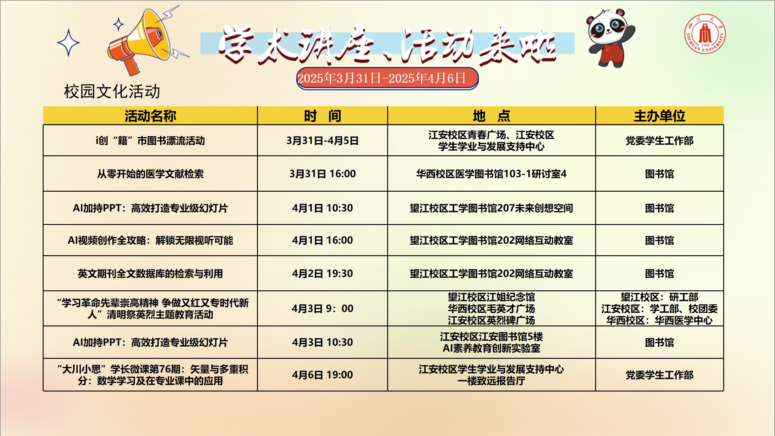 校园文化活动预告(2025年3月31日-2025年4月6日)