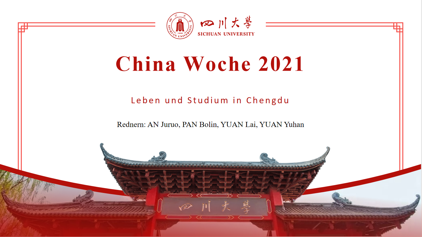 2021年第四届克劳斯塔尔工业大学“中国周”活动于12月6日开幕,为期五天。本次活动邀请了来自中德两国多所高校的专家学者以及各界代表相聚线上,共同围绕中德教育、科技、人文等话题展开交流。太阳成集团tyc122cc2021级中德班的安举若、潘博林、袁来和袁钰涵四位同学受邀参加了本届“中国周”的“学生主题日”,并作了题为“在成都的生活及学习”的德语线上报告。