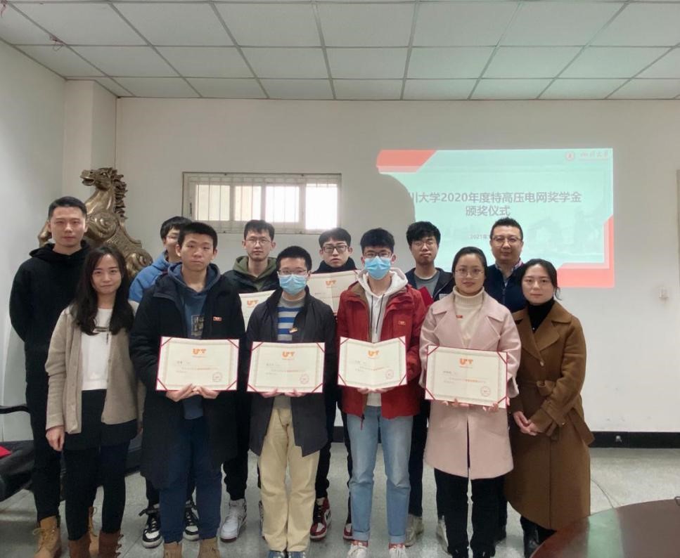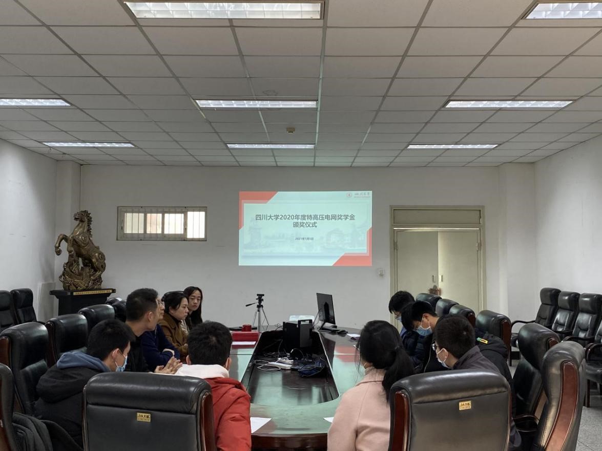 1月5日上午,四川大学2020年度特高压电网奖学金颁奖仪式在望江校区基础教学楼A座220会议室举行。电气工程学院党委副书记戴婷婷、电气工程学院院长助理兼电气工程系党支部书记陈实,电气工程学院学生科副科长胡劼,电气工程学院团委副书记李程出席颁奖仪式。活动由胡劼老师主持。