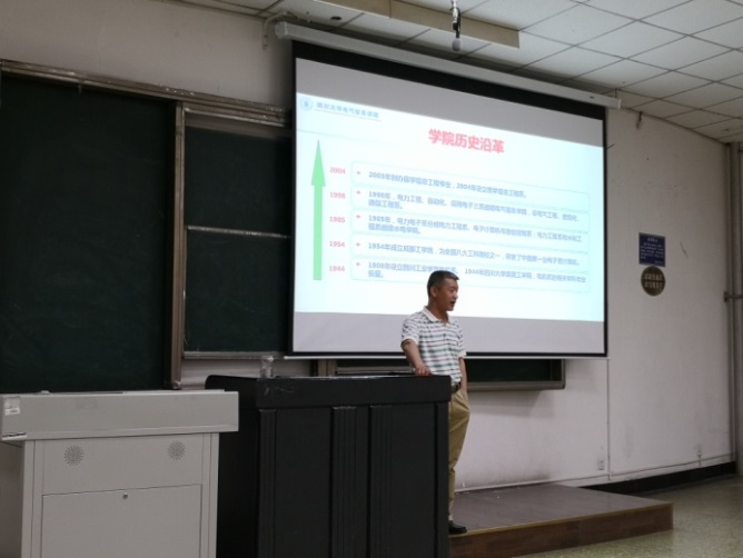 紧接着,肖先勇教授给同学们讲解了学院发展历程。一方面,他充分肯定从上个世纪至今,学院取得的优异成绩;另一方面,他也着重分析了当前我院发展所面临的新形势。他强调,在面临各类竞争的同时,我院的发展进入前所未有的艰难时期,越是艰难,越具挑战,越有机会。作为四川大学电气信息学院的一员,我们应该不惧艰险,团结协作,勇担时代赋予我们的责任,把握住发展机遇,共建共创国际领先水平的电气学科。