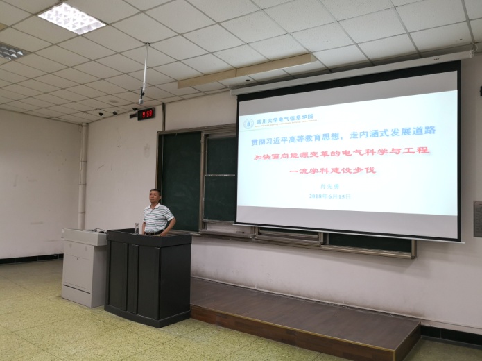2018年6月15日上午,电气信息学院院长肖先勇教授走进2015级本科生的形势与政策课堂,为同学们讲授以“加快面向能源变革的电气科学与工程一流学科建设步伐”的专题思想政治理论课。辅导员于孜清老师以及全体2015级本科生参加了此次课程。