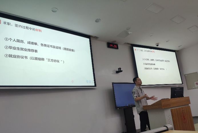 随后,胡劼老师向毕业班研究生们讲解了求职的具体事宜,对招聘信息获取渠道、协议书的签订方式以及就业过程中可能遇到的雷区,进行了较为详尽的介绍,进而帮助同学们了解求职的基本流程、注意事项和需要提前做好的准备。动员会结束后,两位老师对现场同学的疑惑进行了一一解答。