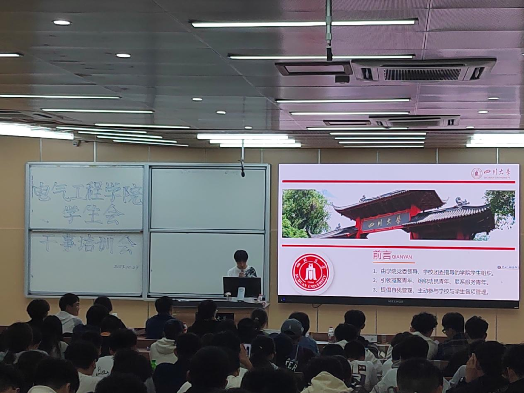 10月29日,电气工程学院团委学生会2023-2024学年第一次干事培训会在江安校区综合楼C座307室顺利举行。电气工程学院团委书记汤博老师、2023级辅导员杨龙杰老师、团委学生会2022级主席团、各部门部长及全体干事参加了本次活动。