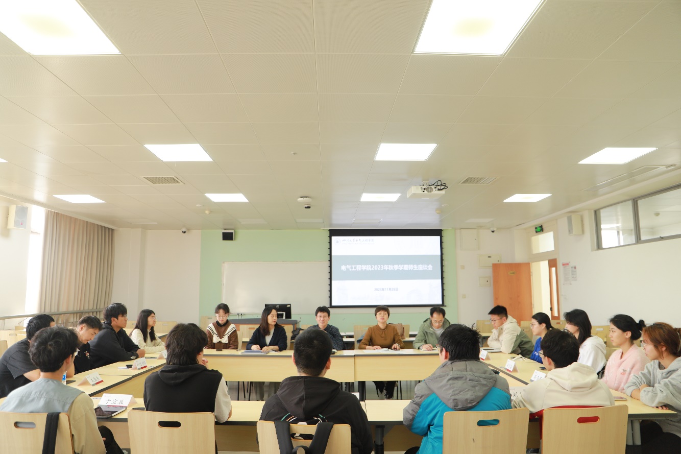 为更加全面、深入地了解2023级本科生入校以来的思想、学习与生活情况,11月28日下午,电气工程学院在江安校区举行了2023年秋季学期师生座谈会。学院党委书记赵昱辉,教务科科长王晓芳,2023级本科生辅导员李程、杨龙杰,以及2023级学生代表参加了本次座谈会。