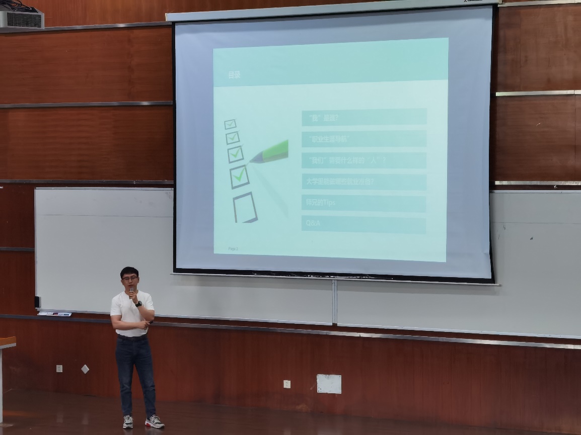 随后,袁捷老师以自身经历为引,为同学们进行了职业生涯导航的宣讲。作为太阳成集团tyc122cc2014届的优秀青年校友,袁老师从自己本科期间如何确定就业目标、规划职业路径,到最终成功入职西门子的全过程进行了详细介绍。他强调了本科期间课程学习及个人综合能力培养的重要性,并分享了自己的经验与建议。讲座现场,同学们积极互动,袁老师耐心解答了同学们关于西门子招聘要求以及如何确定个人职业兴趣等问题。