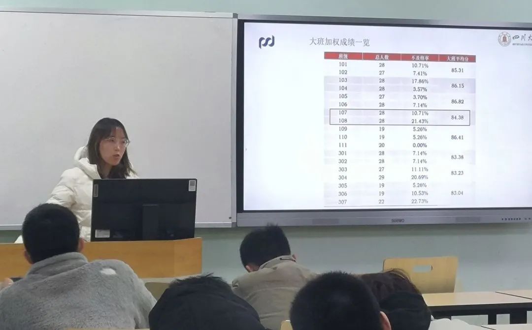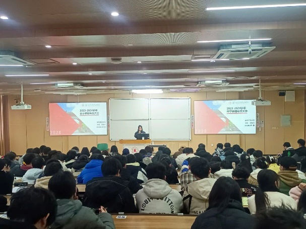 班会上,各班班主任针对班级情况进行了总结并向同学们提出期望。101102班班主任刘继春、刘挺坚老师指出,新时代学生干部应敢做敢为,在工作及学习中均以身作则,做好班级同学的榜样标杆;只有班集体凝聚力量、共同发力,班集体才能蓬勃发展。107108班班主任陈韵竹、焦宁老师强调了学习的重要性以及学期成绩对考研和今后工作的影响,并希望同学们将更多的精力投入到学习当中。303304班班主任龚薇、赵涛老师针对班级成绩做了分析和评价,指出了班级学习存在的不足并提出了改进建议,希望同学们在今后的学习中有所提升。