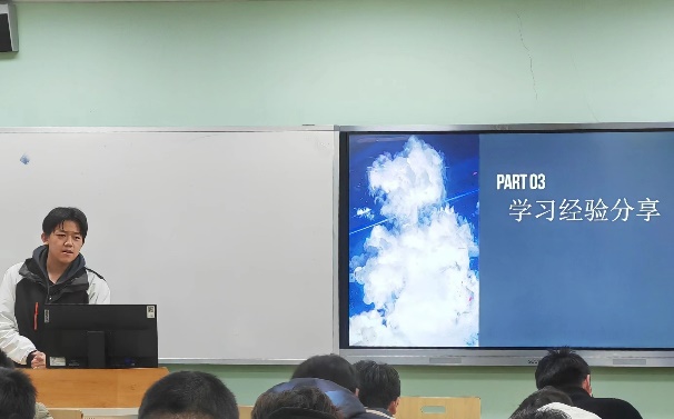 103104班刘靖宇、章志鹏同学与班级同学分享了他们数学学习的经验技巧,提出“预、思、记、做”的学习方法,他们指出课前预习是跟上老师课堂节奏的关键,对问题要有自己的思考,学会推导证明、总结归纳尤为重要。301302班张志远同学提出,在平常的学习过程中,应紧跟老师课堂思路,学会自己理解与思考问题,习惯提出“为什么”,在刷题后及时总结课程的逻辑与特点。107108班学习委员马振航同学认为,作为学生应当分清主次任务,端正学习态度,合理利用学习资源,共同创造良好学习环境。