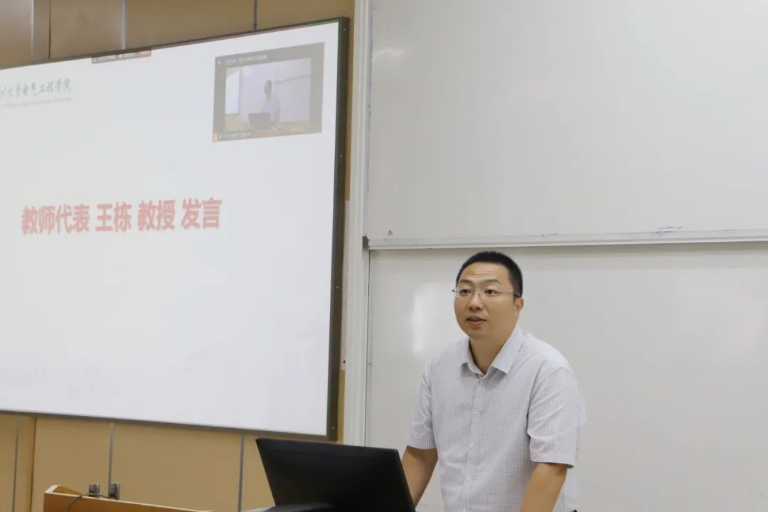 电气工程学院教师代表王栋教授发言。他表示,新同学们的到来为学院注入了无限活力与希望。他鼓励同学们完成角色转换,明确发展目标,实现从被动学习到主动学习的转变,并规划未来路径。同时,王栋教授强调要强化能力塑造,夯实成才根基,脚踏实地、勤奋积累,在集体中奉献与成长。他希望同学们能正确面对可能遇到的挫折和失败,从中学习并不断进步。全院教职员工将以饱满热情和务实作风,为新同学们的人生新阶段奠定坚实基础,陪伴他们成长。最后,王栋老师还鼓励同学们感受成都的独特魅力,并预祝同学们学业有成。