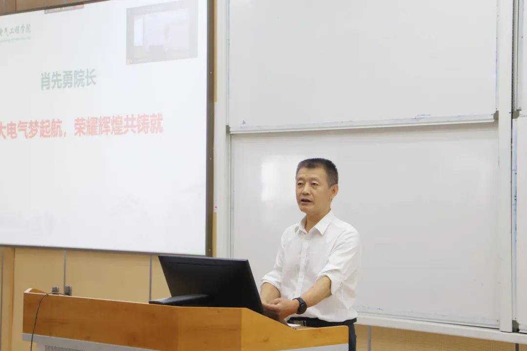 典礼上,肖先勇院长以“川大电气梦起航,荣耀辉煌共铸就”为主题,对新生的到来表示了最诚挚的欢迎和美好的祝愿,并分享了“川大电气——希望与梦想的摇篮”“川大电气——志向与远航的灯塔”“川大电气——荣耀与辉煌的见证”三点心语。肖院长首先回顾了电气工程学院辉煌的历史与杰出的校友,强调了学院在国家能源电力事业及重大战略需求中的重要作用,激励新生以这些优秀前辈为榜样,怀揣梦想,勇于追求。接着,他强调了学院作为新生志向与远航的灯塔,将为大家提供全方位的支持与指导,帮助新生克服成长中的种种困难与挑战,助力他们实现自我价值与人生目标。最后,他展望了新生们的未来,希望每位同学都能在学院的培养下,成为精通关键核心技术、具备解决重大复杂工程问题能力的栋梁之才,为社会的进步与发展贡献力量!