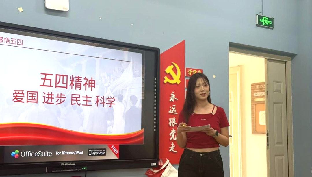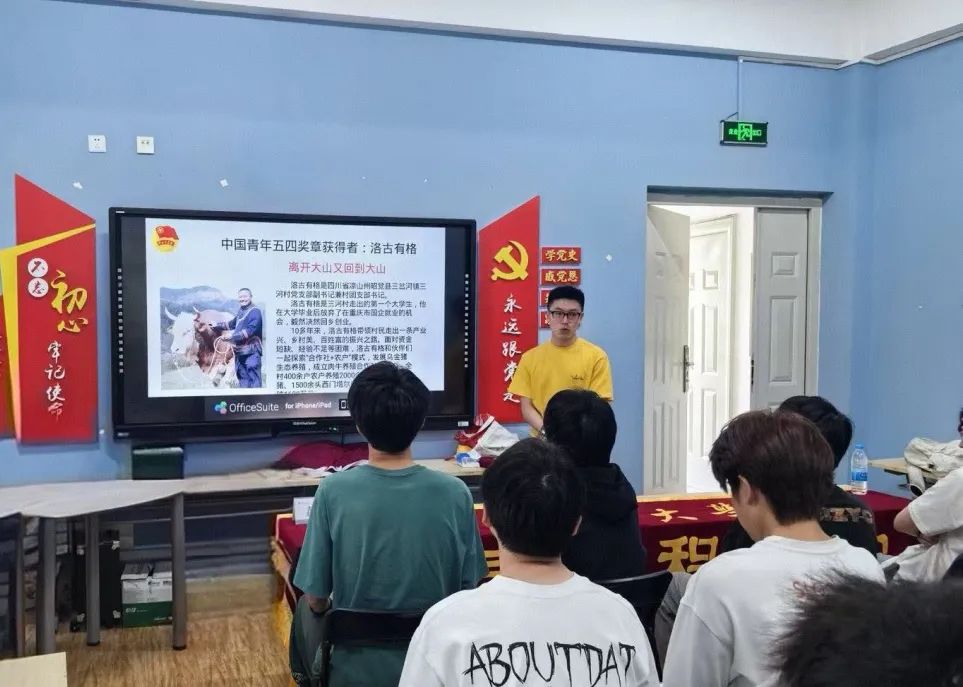 团日活动开始,全体同学齐唱团歌。随后,百川宣讲团成员杜昀瑾以“青春挺膺担当,五四赓续辉煌”为主题展开宣讲,从“寻源五四”到“五四经过”再到“感悟五四”,层层递进,让同学们随着历史的脉络深刻体悟五四精神的时代意义,激励着同学们以实际行动为民族复兴贡献青春力量。