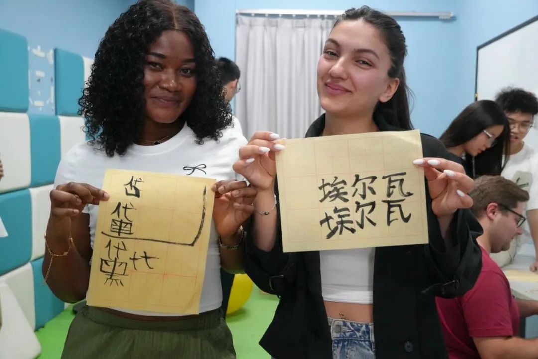 “手腕要稳,笔锋这样转……”来自电气工程学院中德班的同学铺开宣纸,指导德国友人执起狼毫。当“黛比”“埃尔瓦”等中文名字在宣纸上渐次成形,留学生们惊喜地发现,汉字的提按顿挫间竟藏着如此丰富的韵律。