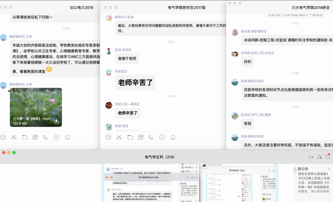 同时,老师们再次强调了学校关于学生管理方面的要求,提醒同学们坚持每天在规定的时间内打卡“四川大学微服务——健康每日报”;要求所有学生耐心等待学校通知,返校时间未确定之前,一律不得提前返校。此外,各位老师还在线为学生答疑,并就各自年级所存在的一些实际情况,提出参考建议。