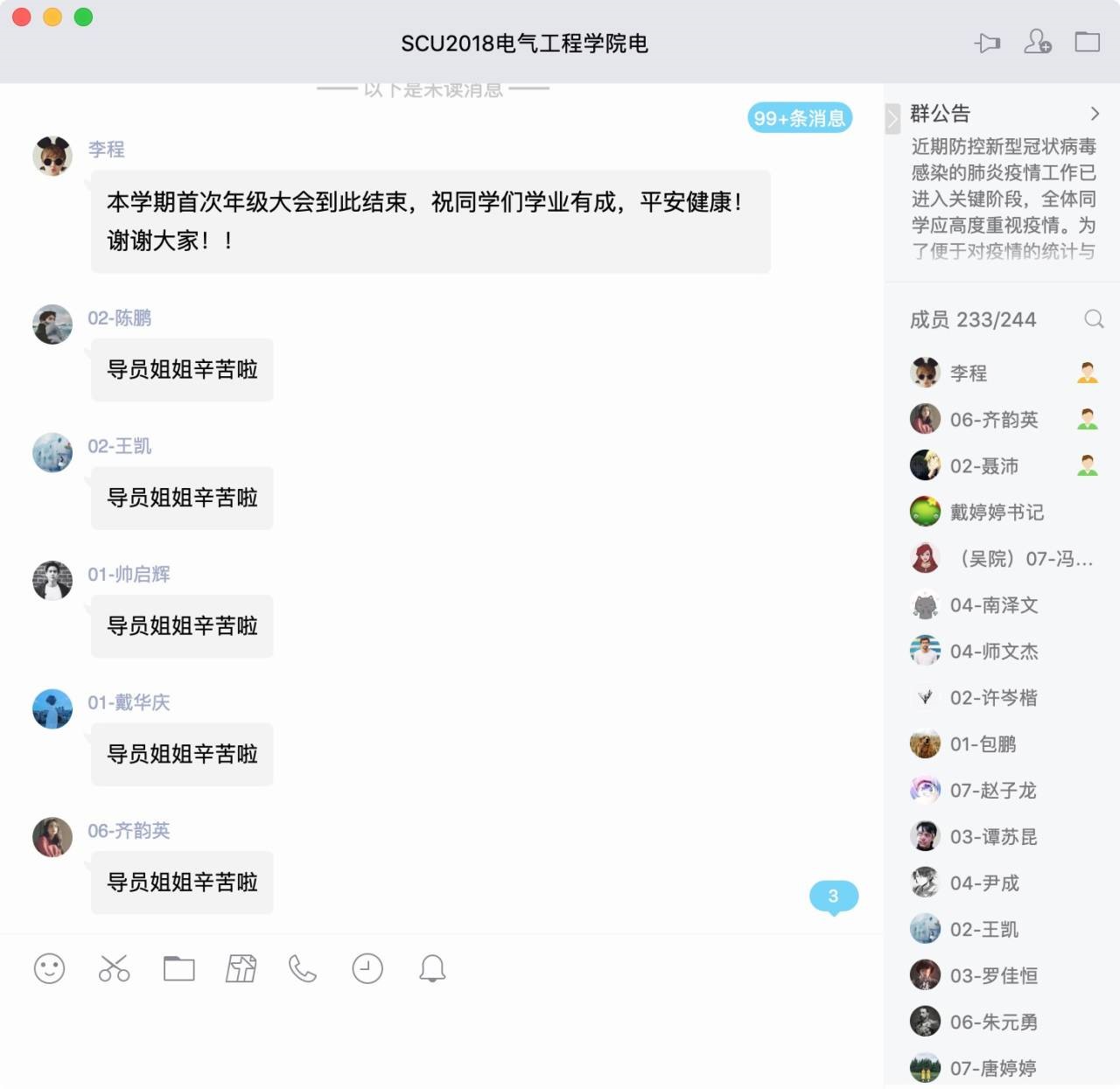 本次年级大会,各专兼职辅导员采用了文字传达、语音与视频直播等多样化的线上模式。虽然相隔千里,但仍阻挡不了师生间亲密的交流与互动;本次年级大会重点强调了以下三方面内容。第一,要进一步统一思想,增强战胜疫情的信心。作为青年大学生,在疫情面前,要保持理性,做好疫情防控,保护好自己;同时要坚定信心,不传谣不信谣,相信在党和国家的领导下,在全国14亿人的共同努力下,我们定会夺取抗击疫情的最终胜利。第二,要尽快适应线上教学,从思想和行动上做好开学准备。新的线上教学模式要求大家提高自觉性和适应能力,积极与老师配合,有问题也要及时与老师沟通;虽然身处校外,但学习丝毫也不能松懈。第三,要严格遵守学校的相关规定,尤其不得提前返校。