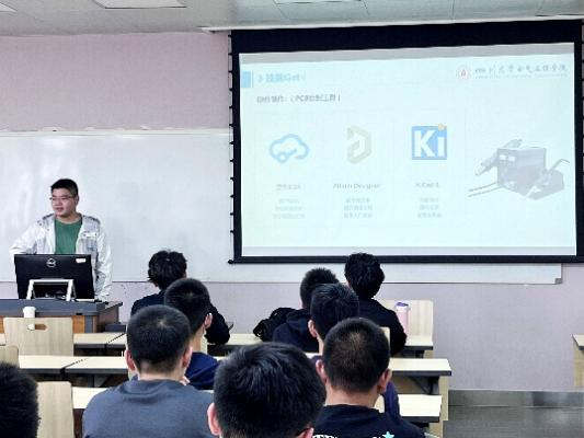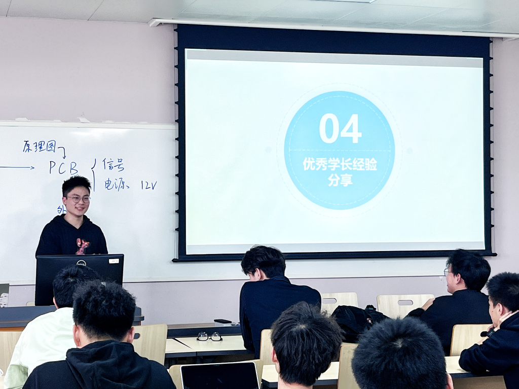 随后,协会相关成员分别从不同方面向同学们介绍了比赛需要掌握的专业技能知识。汪磊同学介绍了硬件方面的技能知识,讲述了绘制PCB板的相关软件及方法;程睿同学分享了自控相关的技能知识,介绍了单片机的选择并分享了代码调试和软件选择的经验;黄文俊同学针对视觉相关的技能知识,引入数字图像识别的例子,分享了openCV的学习方法,向同学们推荐了学习方法和相关途径。