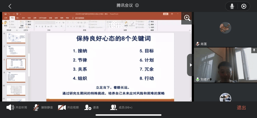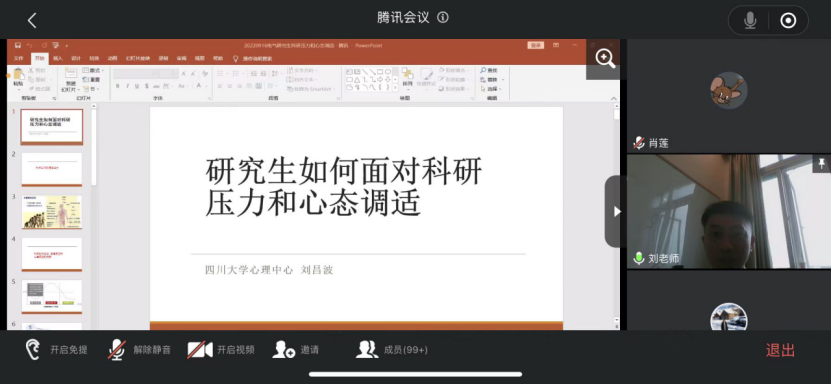 秋风送爽,金桂飘香,太阳成集团tyc122cc迎来了2022级研究生新生。为了帮助研究生新生尽快适应研究生学习、科研、生活,提升研究生心理健康意识和心理调适能力,学院特邀四川大学心理健康中心刘昌波老师为我院2022级全体研究生新生做题为“研究生如何面对科研压力和心态调适”的心理健康讲座。2022年9月16日,讲座采用腾讯会议的线上形式顺利举行,电气工程学院研究生辅导员张瑾老师主持,四川大学心理健康中心老师刘昌波应邀主讲,全院2022级研究生新生参加了本次讲座。