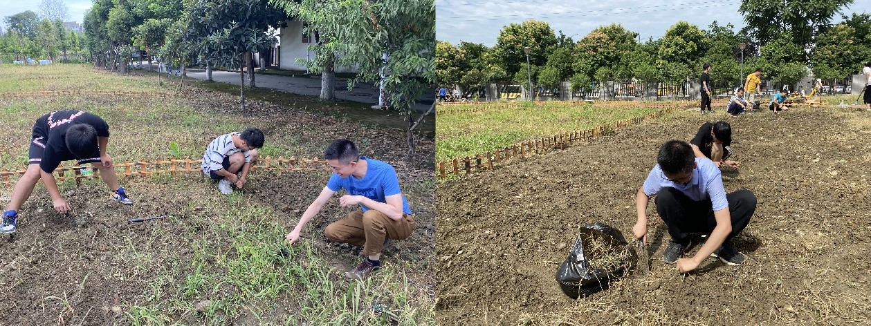 同学们在辅导员的带领下松土除草