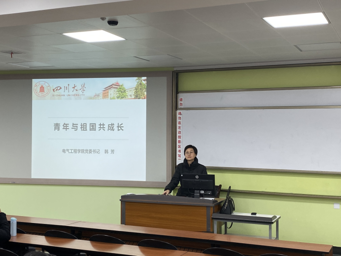 2019年11月29日下午,电气工程学院党委书记韩芳以“青年与祖国共成长”为主题,在江安校区一教B307为2019级电气工程及其自动化专业本科生开讲形势与政策专题思政课,勉励同学们以优秀的青年才俊为榜样,做一个有担当、肯奋斗、求上进的青年人。