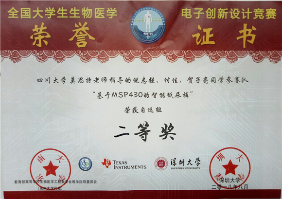 此外,另由莫思特老师指导、王妍卉等完成的《婴儿睡眠监护及报警系统设计》和刘帆等完成的《基于Android的老人摔倒呼叫系统》,以及由黄华老师指导、何飞等完成的《可穿戴病房智能体温贴》等作品荣获自选组三等奖。