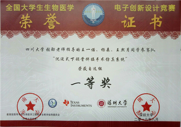 8月26日至28日,由教育部高等学校生物医学工程类专业教学指导委员会主办的“2018年全国大学生生物医学工程创新设计竞赛”决赛在深圳大学西丽校区举行,我院医学信息工程专业的两支参赛队伍参与了决赛答辩环节。其中,由学院张劲老师指导,王一诺、杨森、王熙月参与的作品《沉浸式下颌骨拼接手术仿真系统》斩获自选组一等奖;学院莫思特老师指导,倪志强、付佳、贺子亮参与的作品《基于MSP430的智能纸尿裤》荣获自选组二等奖;张劲老师荣获“优秀指导老师”。