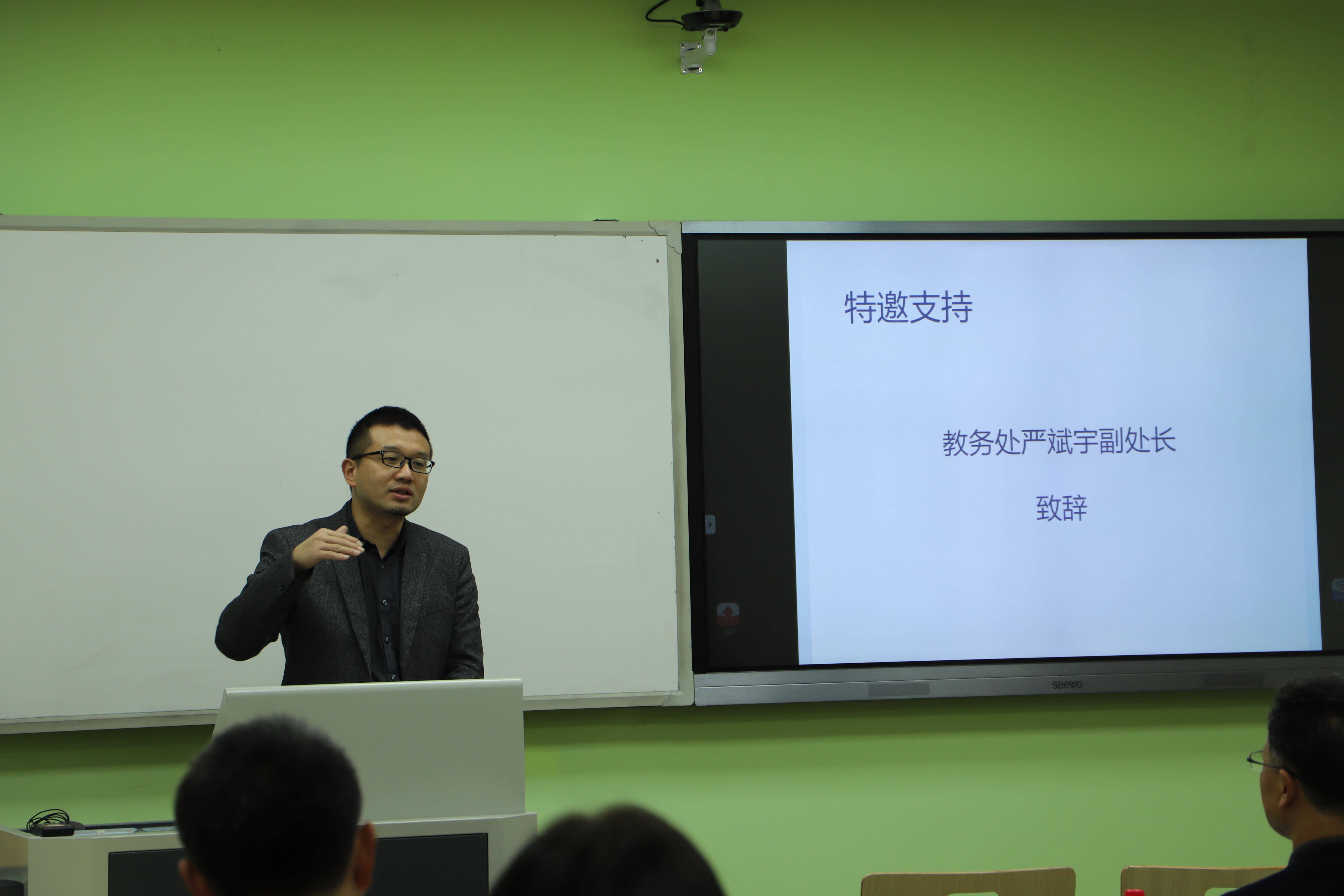 比赛由分管副院长李长松主持。他首先强调了此次比赛的背景和意义,并代表学院向评委及参赛教师对我院本科教学工作的重视和支持表达了诚挚的感谢。教务处张红伟处长特别委托严斌宇副处长来到比赛现场并讲话。严处长回顾了学校教学竞赛的发展历程,介绍了本次教学竞赛“基于不同类型智慧教室的‘探究式-小班化教学创新”的主题,并预祝今天的教学竞赛取得成功。