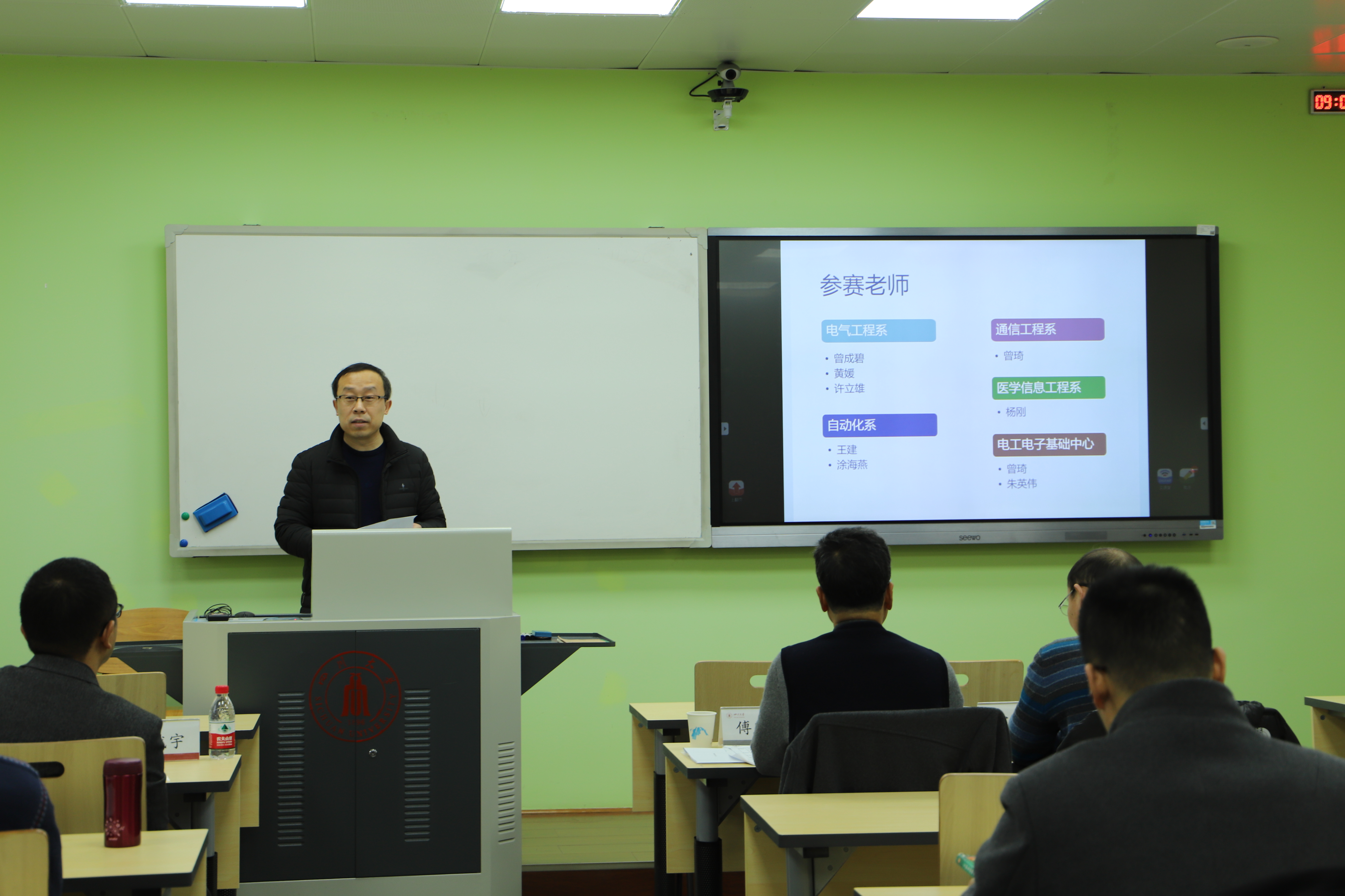 经过各系中心及课程组前期的共同努力,推举出电气工程系曾成碧、黄媛和许立雄、自动化系王建和涂海燕、通信工程系曾琦、医学信息工程系杨刚、电工电子基础教学实验中心曾琦和朱英伟共9位老师参加了于20181221日上午举行的教学竞赛现场授课阶段比赛。比赛邀请了校督导委专家傅师申老师、电气信息学院督导组组长敬东、电气信息学院电工电子基础教学实验中心雷勇(教育部高等学校电工电子类课程教指委委员)和周群(校督导委专家)担任评委。部分参赛课程组教师及青年教师现场观摩了比赛。