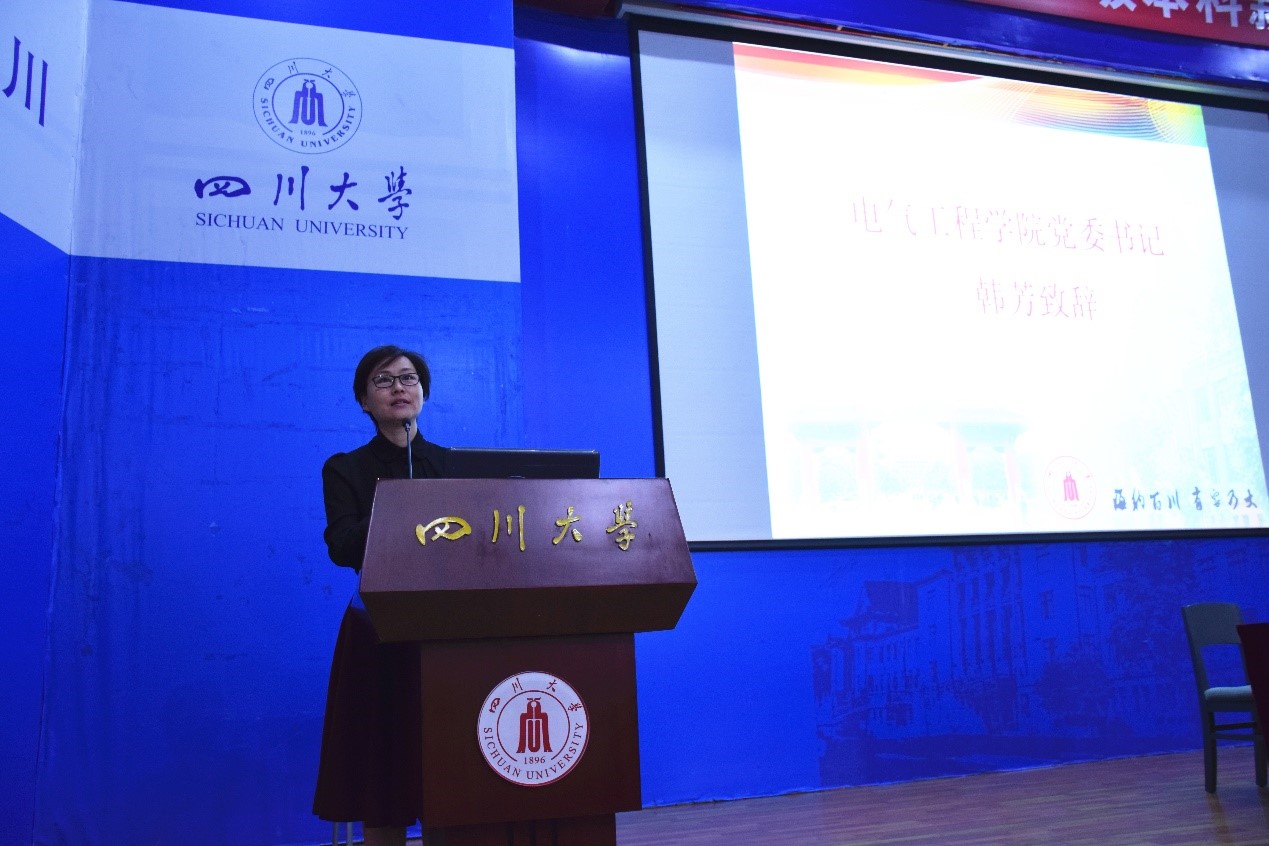 上午9时,开学典礼在庄严肃穆的国歌声中拉开帷幕。学院党委书记韩芳致开幕辞。韩书记首先向怀着远大志向、经过艰难苦读考入电气工程学院的421名新生表示热烈的欢迎和真诚的祝贺。韩书记说,四川大学作为百年名校和全国排名前十的“双一流”建设A类高校,其使命是培养国家栋梁和社会精英。同学们肩负着未来二三十年代表中国走向世界舞台引领世界的使命,同学们成长的高度就决定了中国未来发展的高度。韩书记对新生提出了三点希望:一是立大志,树立责任担当;二是学本领,养成良好品行;三是知敬畏,做到自信自律。希望同学们明确发展目标、培养独立意识、学会自信自立,磨练出遇到挫折不轻言放弃的精神。韩书记表示,电气工程学院有着深厚的文化底蕴和良好的精神传承,每一位老师都将倾尽所能为大家传道受业解惑,祝愿每位同学不负韶华,在川大电气学有所成!