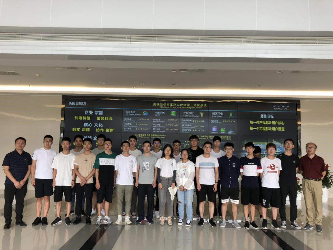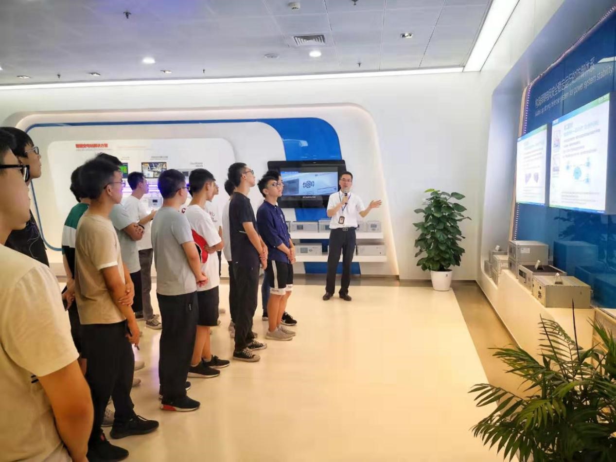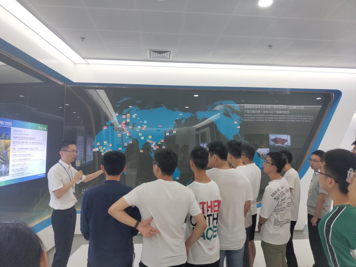 在开班典礼前,南瑞继保公司徐超经理带领学院实习团队深入体验了企业文化。同学们首先参观了企业展厅,公司徐经理向同学们详细介绍了公司的核心发展思路、业务领域、生产服务和今后的发展目标。同学们了解到,南瑞继保公司是一家专业从事电力系统保护和控制领域的技术研究、产品开发、生产销售和工程服务的国家级重点高新技术企业,同时也是中国软件百强企业和中国电气工业百强企业,通过展厅中展示的企业高压/特高压直流输电工程模型、柔性交直流输电实物模型及各类先进仪器的模型,同学们深刻感受到企业不断通过攻克技术难关、取得技术突破、最终创造出具有国内外先进水平的电气产品的奋斗历程,被企业不断进取的精神深深感染。