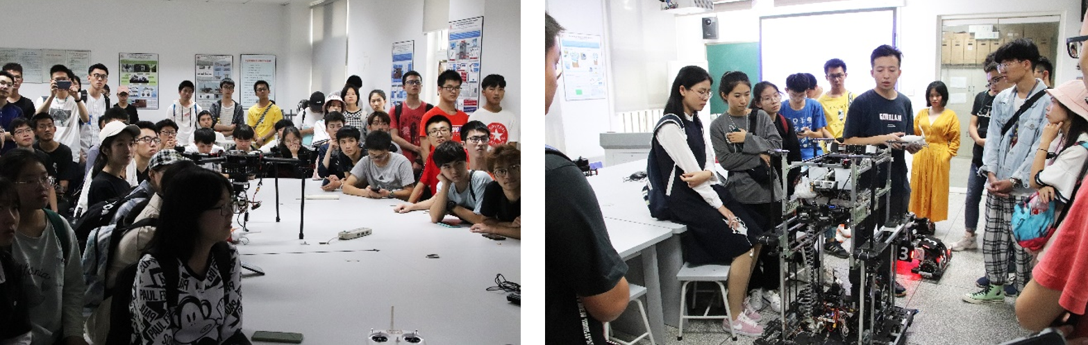 首先研究生学长们向同学们介绍了自动化专业本科实验基本情况,以及大学本科阶段的一些竞赛机会,其中,最近几年开始举办的全国大学生机器人大赛RoboMaster以其鲜明的科技感和对抗性极大地激发了同学们的兴趣,不少同学都积极地提出自己的问题与想法,与学长们探讨交流。