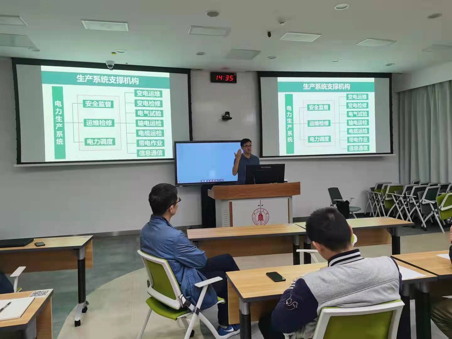 讲座伊始,师生们对万主任的到来表达了热烈的欢迎。讲座中,万主任首先介绍了国家电网的组织机构及电力生产系统的支撑机构,随后就电网变电检修部门一线现状进行了阐述,并指出变电生产业务主要困境在于:一线班组缺员日趋严重,安全生产压力持续增大。