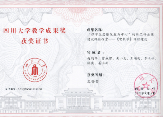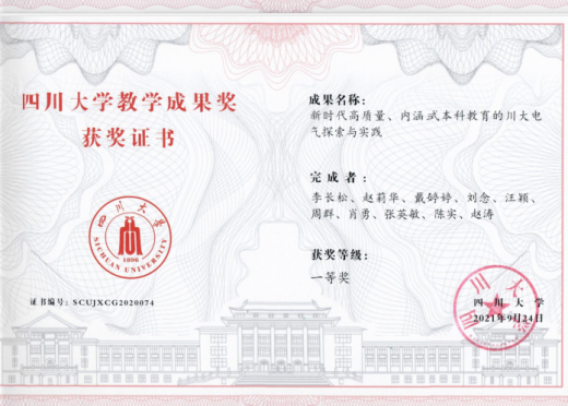近日,学校对2020年四川大学教学成果奖获奖项目进行了表彰,电气工程学院共获得七项教学成果奖,其中特等奖1项,一等奖2项,二等奖2项,三等奖2项。