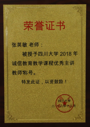 四川大学2018年度诚信教育宣传月主题系列活动经过两个多月的开展顺利落下了帷幕。在此次活动中,我院分别获得“优秀组织奖”、“第四届‘德渥群芳’育人文化建设标兵团队”、“诚信教育教学课程优秀主讲教师”、“研究生‘优秀学术之星’”、“‘诚信’主题文化创意作品-语言文字类(2项)”等6个奖项,充分展示了我院在推进诚信教育和学术道德教育、推进学院诚信体系建设、营造诚信、成才、奋进的校园文化氛围方面所做出的一系列成绩。