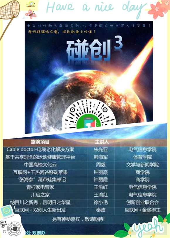 2018年4月23日晚,四川大学第三届“碰创”双创活动于川大江安校区法学院报告厅顺利举行。此次活动由四川大学教务处创新创业领导小组办公室主办,四川大学全球校友创业家联合会、成都校友会同创科技有限公司、四川大学创新创业联合会协办。电气信息学院双创项目导师王渝红教授、朱光亚老师受邀参加了本次活动。