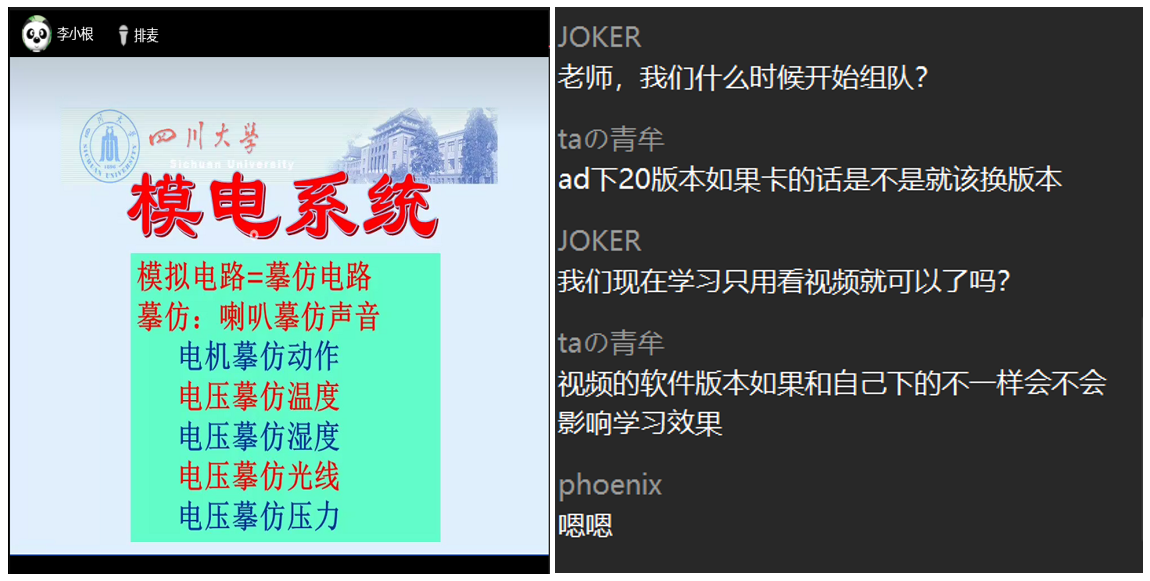 系列讲座的第二场“创新设计”讲座,也在3月21日晚上7:30在19级设计员QQ群群课堂内如期举行,讲座内容主要包括电子设计入门、电子元件、电子系统图以及仿真软件应用入门。讲座中李小根老师运用大量生动的实例讲解了各个电子元件的作用和模电系统,描述了作为未来大赛中设计员角色所需要从事的工作。现场同学同样也都积极通过留言与老师互动,李老师也亲切地为大家解答疑问。