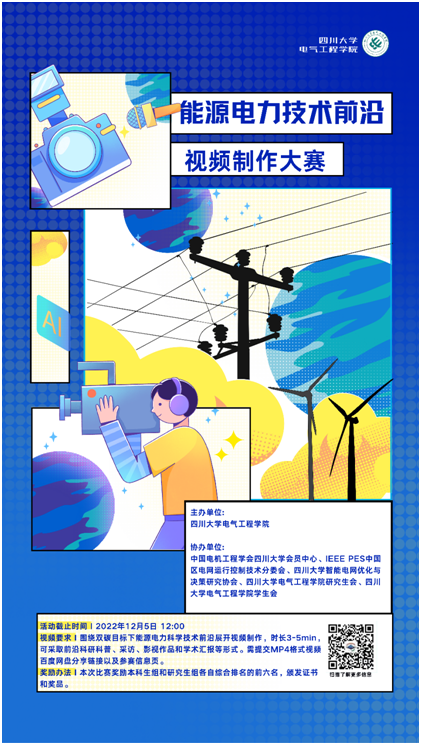 为把握双碳目标下科技创新的前沿动态,开阔学生眼界,培养电气、能源和计算机多学科融合的思维模式,学院于2022年11月2日至12月9日举办“能源电力科学技术前沿”视频制作比赛。