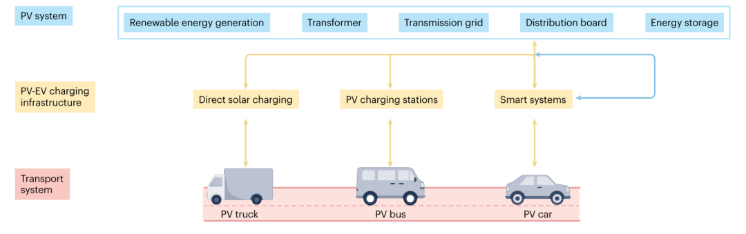 其中,论文创新性提出多模态协同范式:能量流协同,如车载太阳能方式与固定式光储充电站形成互补;信息流协同,如区块链、人工智能等技术实现分布式光伏+充电网络动态高效调度;材料-系统协同,如钙钛矿组件与固态电池联合应用突破能效边界等。通过多模态非物理绑定式耦合,如通过V2X技术建立光伏+电动汽车的柔性连接,通过"光伏-电池-电网"增效作用赋予耦合系统自优化能力,增强交通-电网灵活性同时提升可再生能源消纳水平。