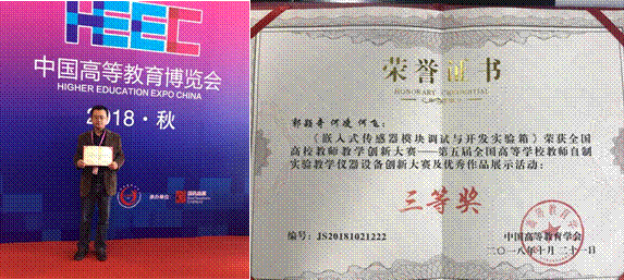2018年10月19日至21日,全国高校教师教学创新大赛——第五届全国高等学校教师自制实验教学仪器设备创新大赛决赛在成都举行。四川大学电气信息工程研究与实验中心郭颖奇老师、医学信息工程系何凌老师和2015级本科学生何飞的参赛作品“嵌入式传感器模块调试与开发实验箱”喜获三等奖,这也是我院在该项全国性大赛上的首个奖项。
