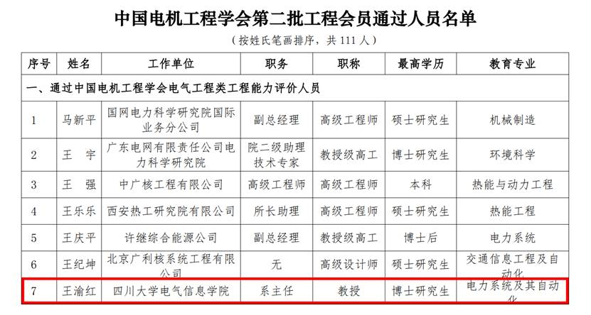 我院王渝红教授通过中国电机工程学会第二批工程会员评价认证