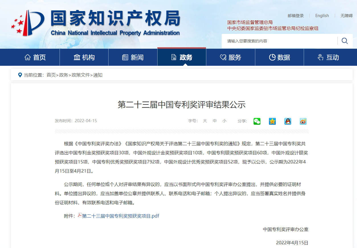 中国专利奖设立于1989年,由国家知识产权局和世界知识产权组织(WIPO)共同评选,是我国专利领域的最高荣誉,也是中国唯一专门对授权专利给予奖励的政府部门奖项,具有广泛国际影响力。