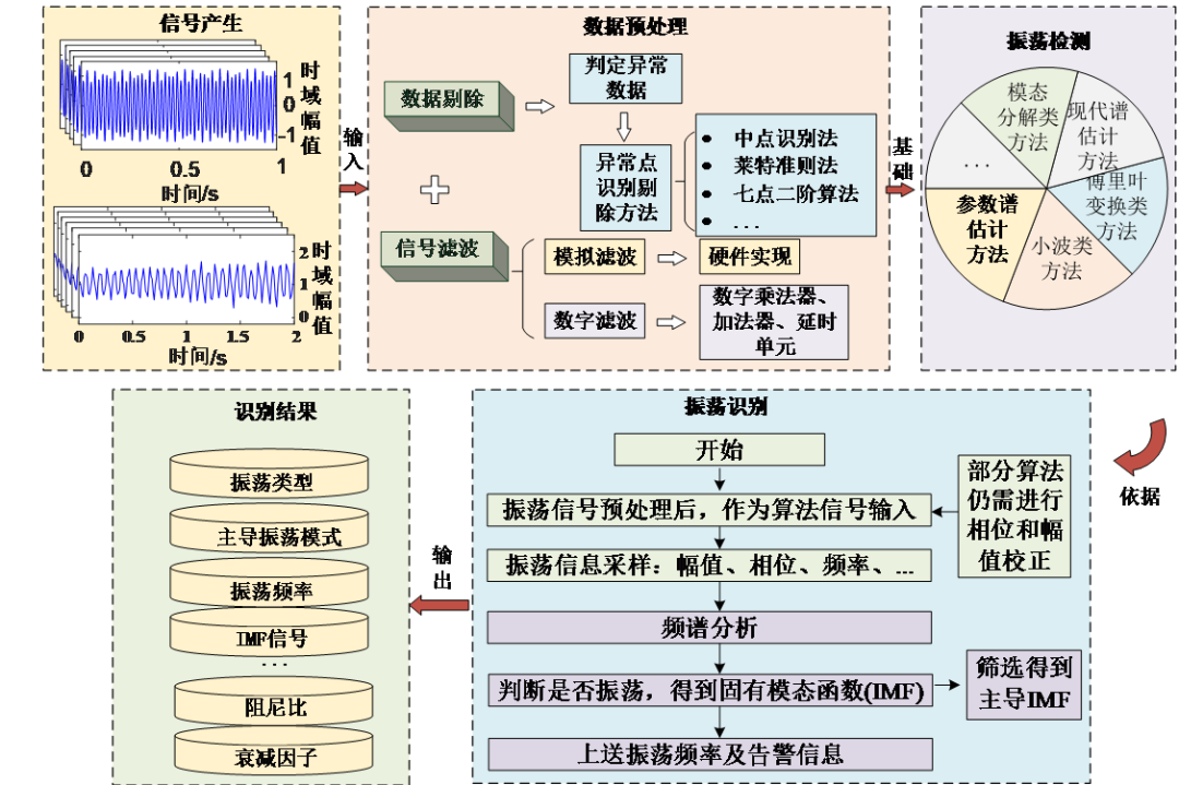 振荡问题的准确检测和辨识,能够获得振荡的频率、阻尼、幅值等信息,提取振荡的特征,为事故溯源与振荡抑制提供了数据参考。辨识方法的实现过程如图5所示,通过对数据的处理和解析,判断振荡是否发生,并可以准确获得振荡的类型、模式等规律,对保障系统稳定运行具有重要意义。